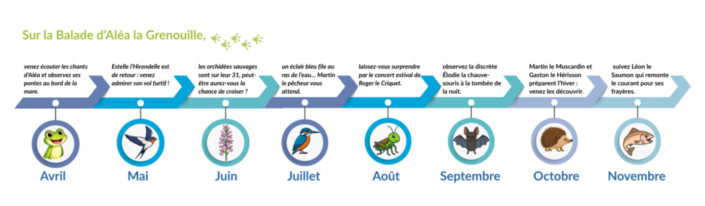 Baptisé « La Balade d’Aléa la Grenouille », ce parcours d’1km guide les visiteurs à travers différents espaces du site : la rivière, la mare, la cabane vivante et les zones naturelles. À chaque étape, le public est invité à observer, comprendre et s’émerveiller face au vivant.